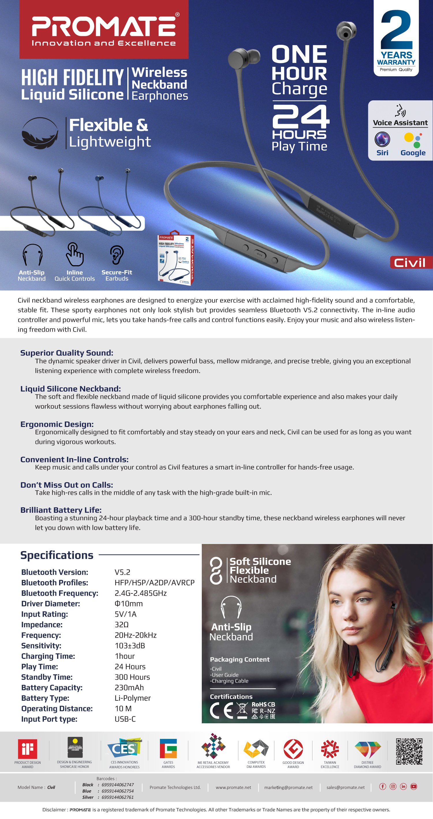صُممت سماعات Promate Civil اللاسلكية داخل الرقبة لتمنحك التمرين طاقةً جديدةً بصوتٍ رائعٍ عالي الدقةٍ وملاءمةٍ مريحةٍ وثابتة. لا تقتصر هذه السماعات الرياضية على أناقتها بل توفر أيضًا اتصال Bluetooth V5.2 سلسًا. يتيح لك جهاز التحكم بالصوت داخل السلك والميكروفون القوي إجراء مكالمات بدون استخدام اليدين والتحكم بالوظائف بسهولة. استمتع بالموسيقى الخاصة بك وكذلك حرية الاستماع اللاسلكي مع سماعات Civil.