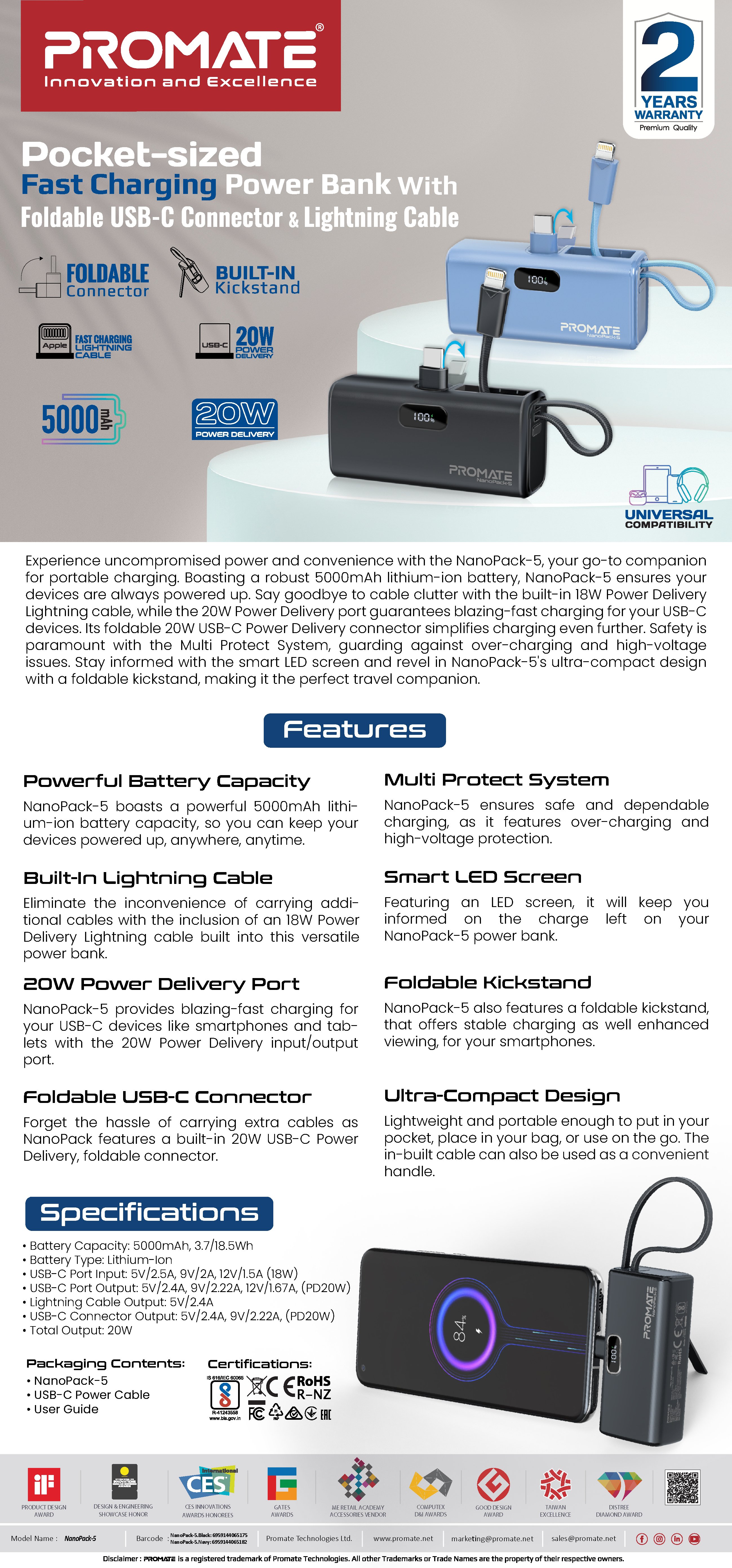 استمتع بالقوة والراحة التي لا مثيل لها مع NanoPack-5، رفيقك المفضل للشحن المحمول. تتميز بطارية NanoPack-5 القوية بقدرة 5000 مللي أمبير في الساعة من الليثيوم أيون، مما يضمن تشغيل أجهزتك دائمًا. قل وداعًا لفوضى الكابلات باستخدام كابل Lightning المدمج، بينما يضمن منفذ توصيل الطاقة بقدرة 20 واط شحنًا سريعًا للغاية لأجهزة USB-C الخاصة بك. يعمل موصل توصيل الطاقة USB-C القابل للطي بقدرة 20 وات على تبسيط عملية الشحن بشكل أكبر. تعد السلامة أمرًا بالغ الأهمية مع نظام الحماية المتعددة، حيث يوفر الحماية من مشاكل الشحن الزائد والجهد العالي. ابق على اطلاع مع شاشة LED الذكية واستمتع بتصميم NanoPack-5 فائق الصغر مع مسند قابل للطي، مما يجعله الرفيق المثالي للسفر.
